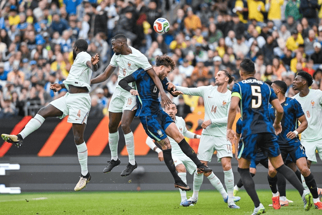 虎扑03月27日讯 国际足球友谊赛,10人作战的法国队2-1战胜巴西队。根据Opta的统计,这是法国历史上第6次战胜巴西。